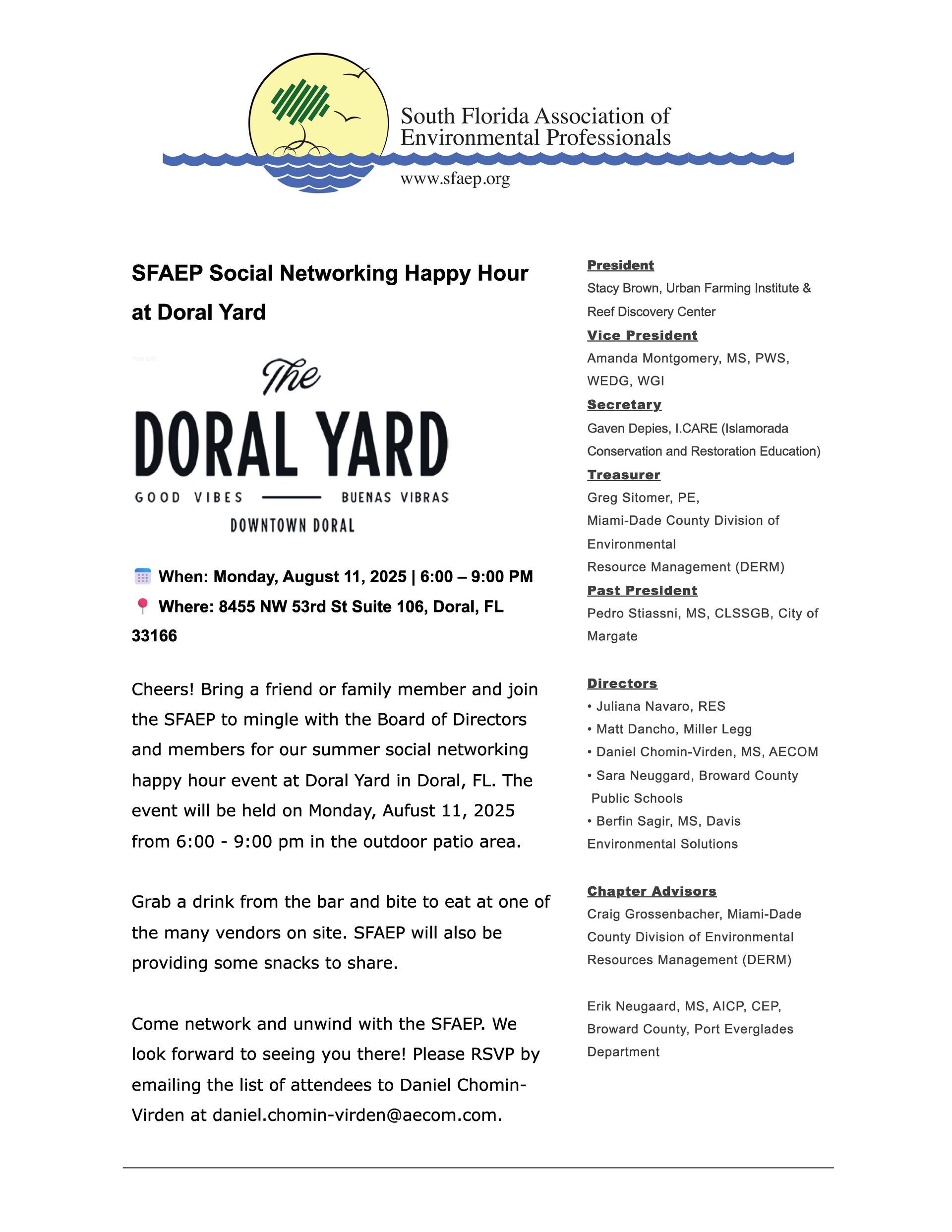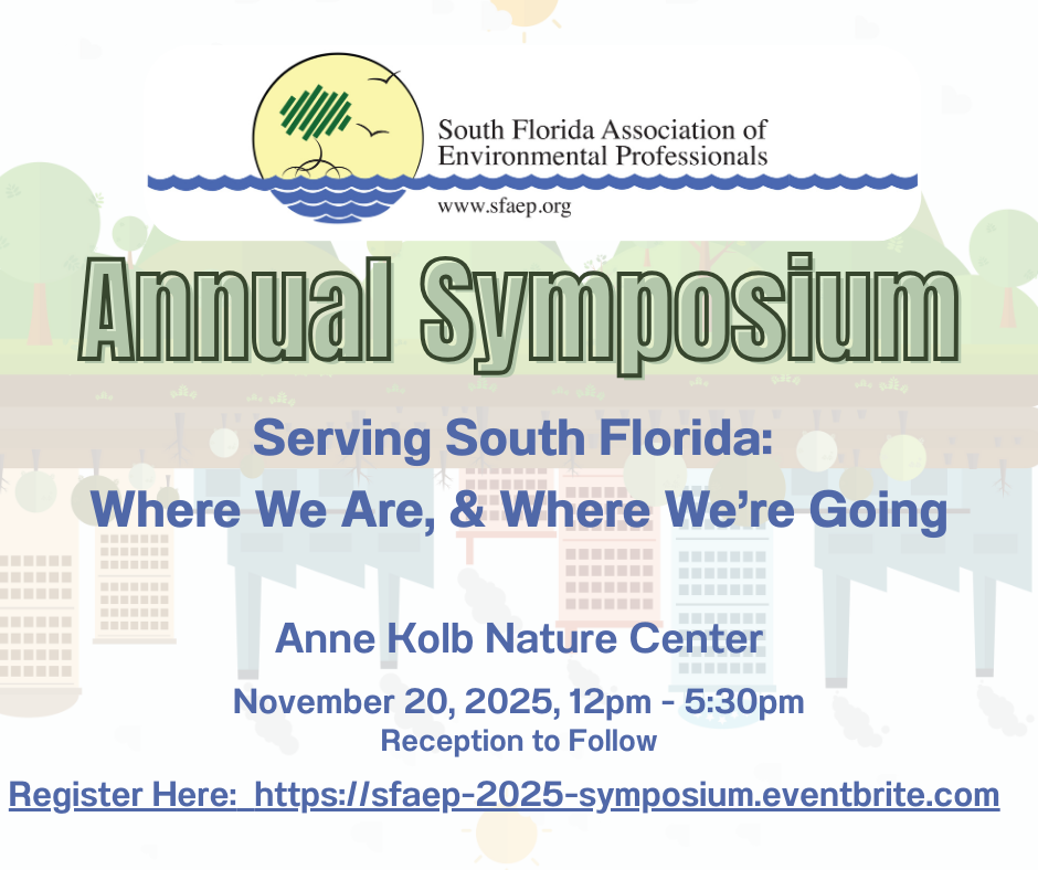 MEMBERS ONLY EVENT. To become a member, visit https://www.faep-fl.org and sign up for the South Florida Associated of Environmental - dual state (FAEP) and local chapter (SO) membership only $75 annually (student and group membership discount rates available). By becoming a member of the SFAEP you will gain direct access to members only events and monthly social networking and training / professional growth & development opportunities via our email campaigns and marketing blasts.
